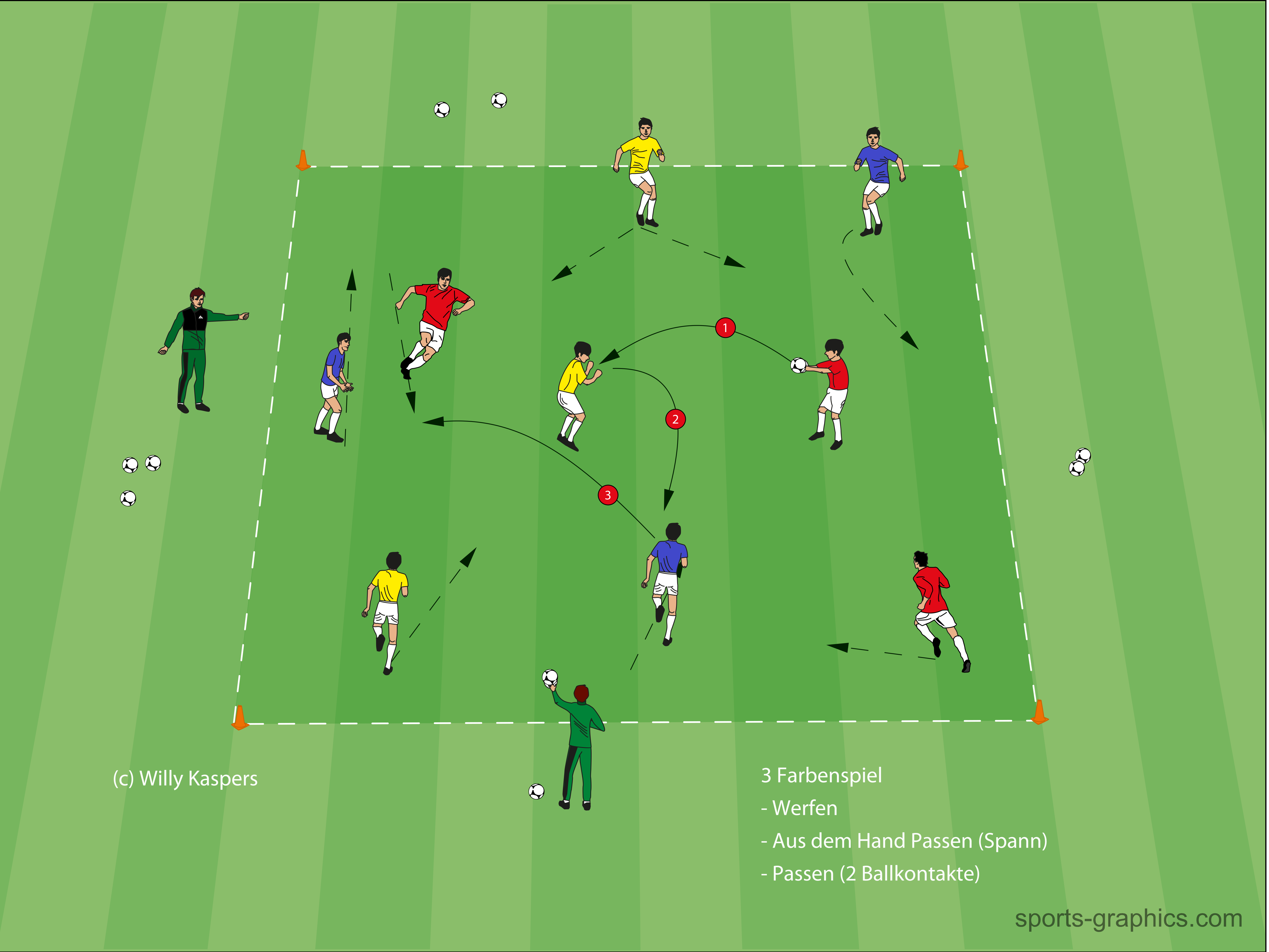 • Angefangen wird mit werfen, ein Spieler von Rot werft seinen Ball zu einem Spieler in Gelb, der Werft seinen Ball zu einem Spieler in Blau. Blau wieder nach Rot …. Etc. auf höchstes Tempo. 3 Serien von 3 Minuten.
